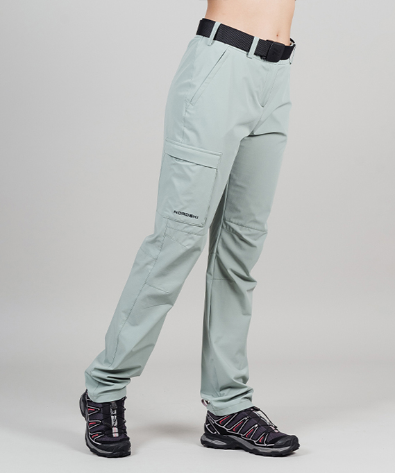 Брюки выполнены из эластичного легкого материала, тянется в четыре стороны. Пояс со шлевками, позволяет вставить ремень и отрегулировать посадку на талии.  Брюки застегиваются на молнию и клепку. Спереди два боковых кармана застегиваются на молнию. Вместительный карман на бедре, позволит разложить нужные вещи.  Брюки прямого кроя с анатомическими вытачками на коленях. В женской модели спинка завышена.